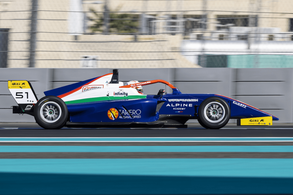 The F4 UAE championship got underway today at the Yas Marina circuit in Abu Dhabi, with Keanu Al Azhari lining up on pole position. Azhari would get a poor start off the line, being swamped by Mumbai Falcons trio Nakamura, Freddie Slater and Alex Powell. Azhari would recover to second place behind Nakamura, who held a 1.5-second lead.