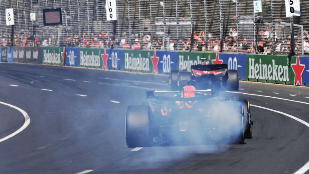 However, eagle eyed spectators would’ve noticed smoke coming from Verstappen’s rear right tyre, with Verstappen coming on the radio reporting “I have smoke, fire, fire, brake, my brake,”.