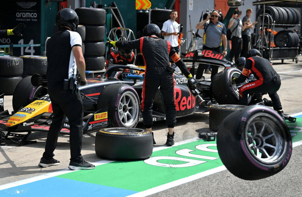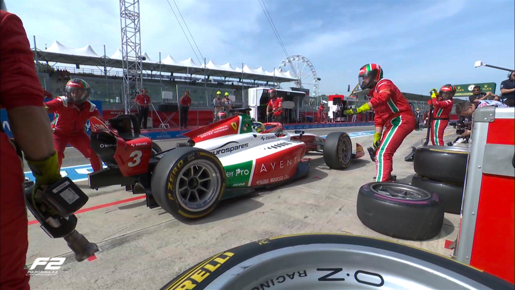 On lap 31 race leader Cordell came in to make his stop, however when he put his foot down and left his box the right rear tyre came flying off the car, ruining what could’ve been his first podium in F2.