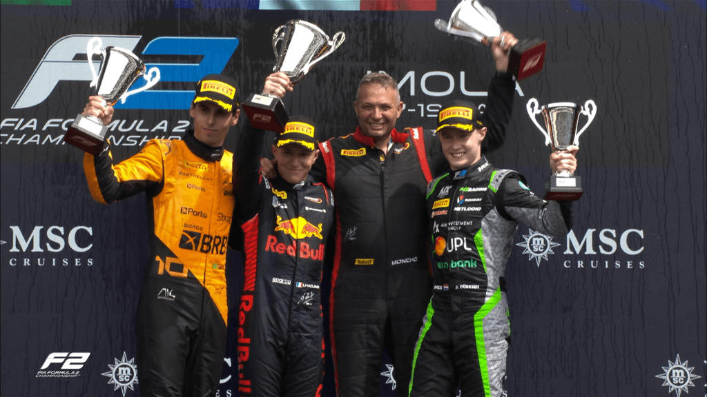 Behind them Joshua Durksen for AIX racing came home third to secure his and his teams first podium in Formula 2, beating Kimi Antionelli who finished 4th for Prema, the Italian team still yet to achieve a podium this season despite having arguably the strongest driver pairing on the grid.