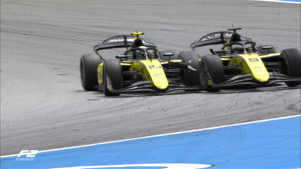 Maini tried to overtake his teammate into turn one, going around the outside of Bortoleto who lost the rear and made contact with his teammate damaging his front wing, but thankfully both managed to continue.
