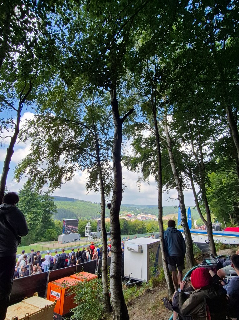 I saw plenty of people sitting on rocks, logs, and even saw a man climb a tree to get a good vantage point. That’s certainly an advantage of the general admission ticket – the improvisation when it comes to getting a seat, and certainly something you would only get at Spa, given its steep elevation and thick forests.